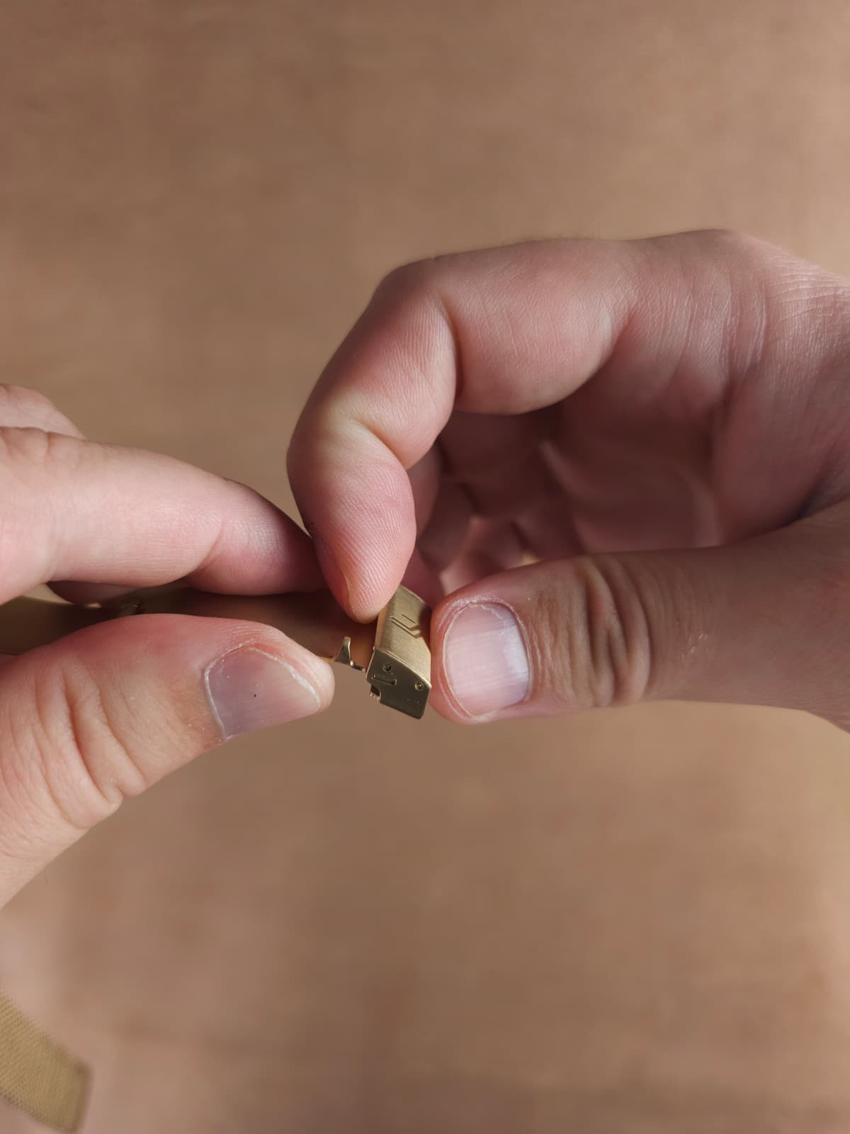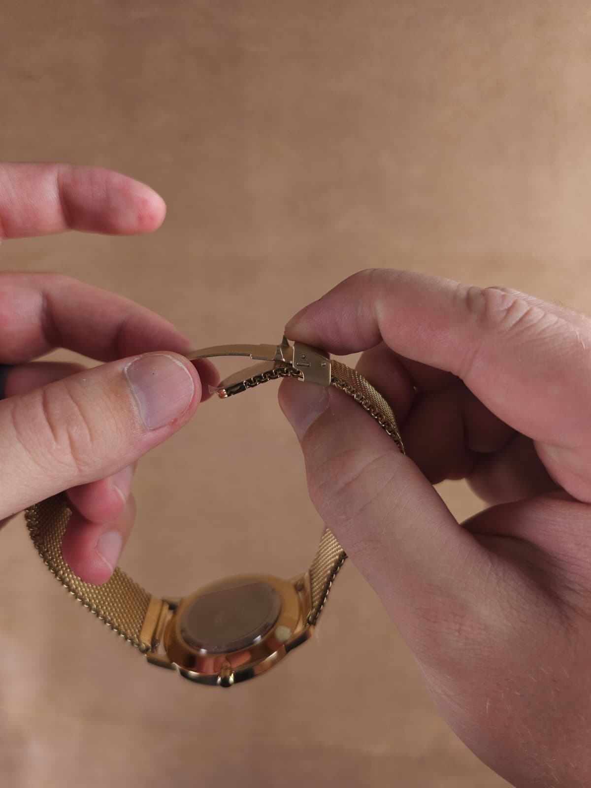 With the tab opened, let the watch dangle and you will see a slit. This is where the other end of the bracelet will slide in.