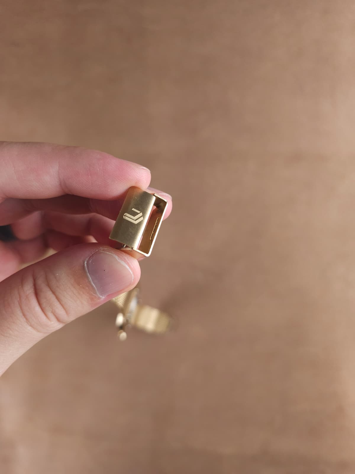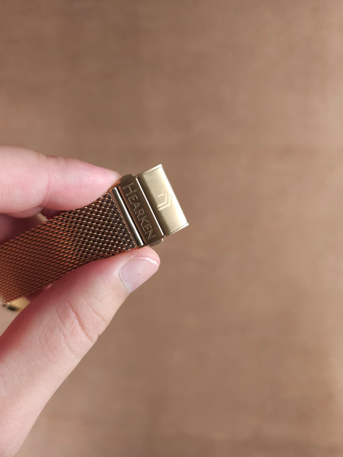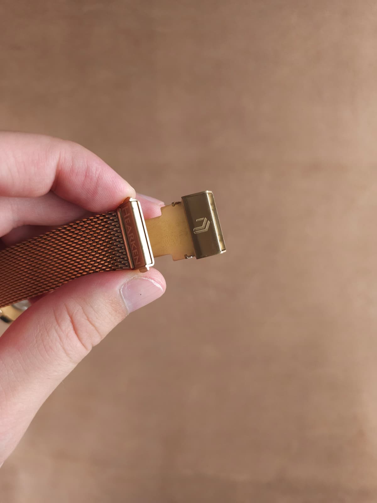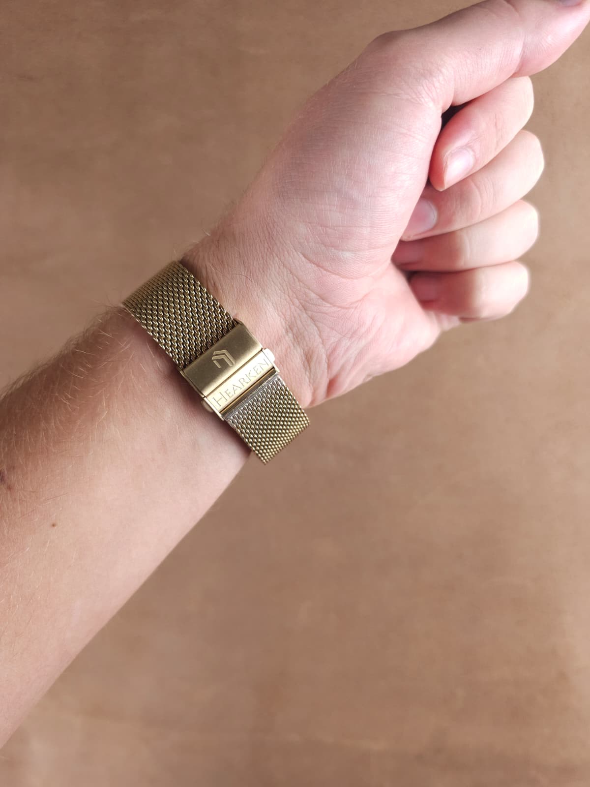 While holding the watch on top, release the tab with the Hearken Logo on it. Once released, tighten the bracelet as necessary and close the tab. If the desired fit is achieved, you are all set! If adjustments are needed, simply release the tab to loosen/tighten.