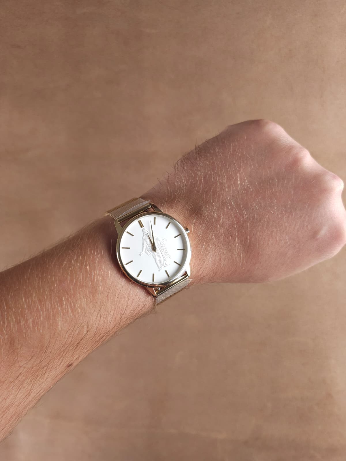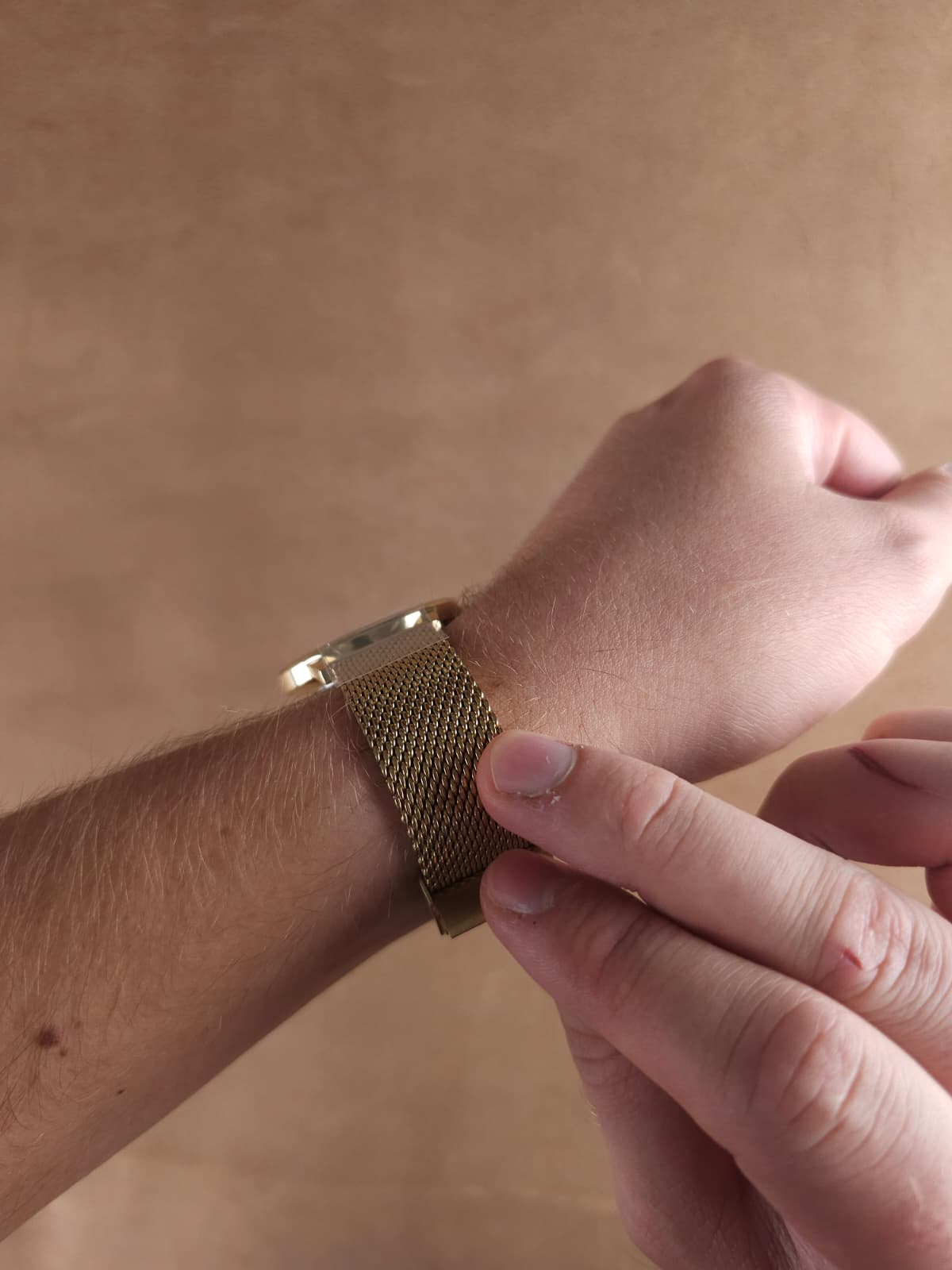 Place the watch on your wrist. It will be very loose before you make the final adjustment.
